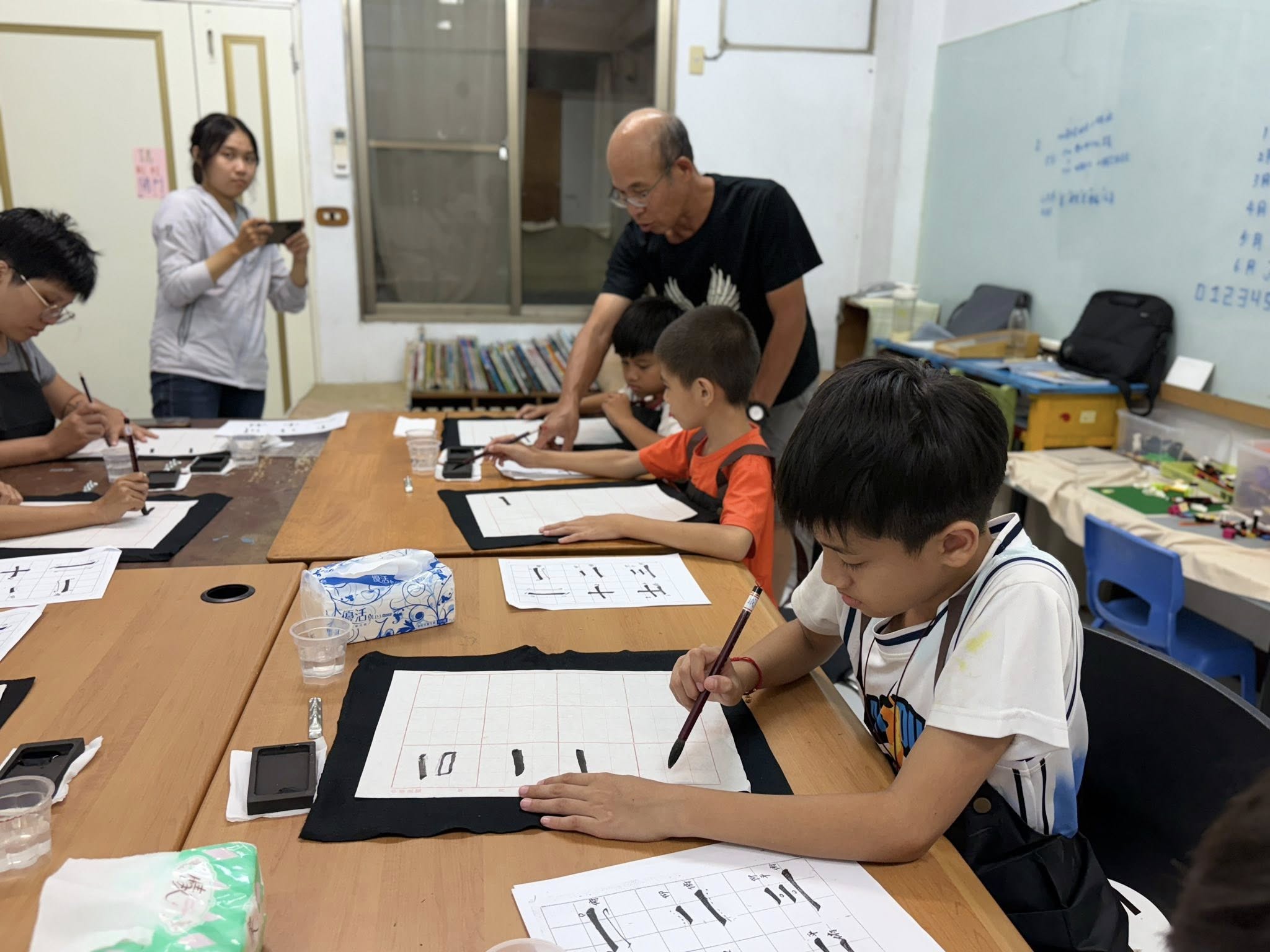 課堂的設計循序漸進,從「一」這樣最簡單的一筆開始。每一筆都需要重複練習、修正與再嘗試。🔁有人因為太快而失誤,也有人在慢下來的過程中找到節奏。🌸漸漸地,孩子們懂得「寫得慢」並不是落後,而是一種穩定與精準。✨