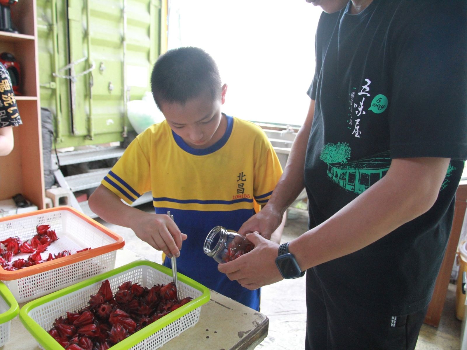 這天的孩子成為了工坊小職人,吐籽、清洗、分類,小手忙個不停,專注又細心。接著還進行蜜餞 DIY,從裝罐開始,然後倒糖水,最後是貼小語,就大功告成啦!一排排完成的成品,孩子們笑得超有成就感。