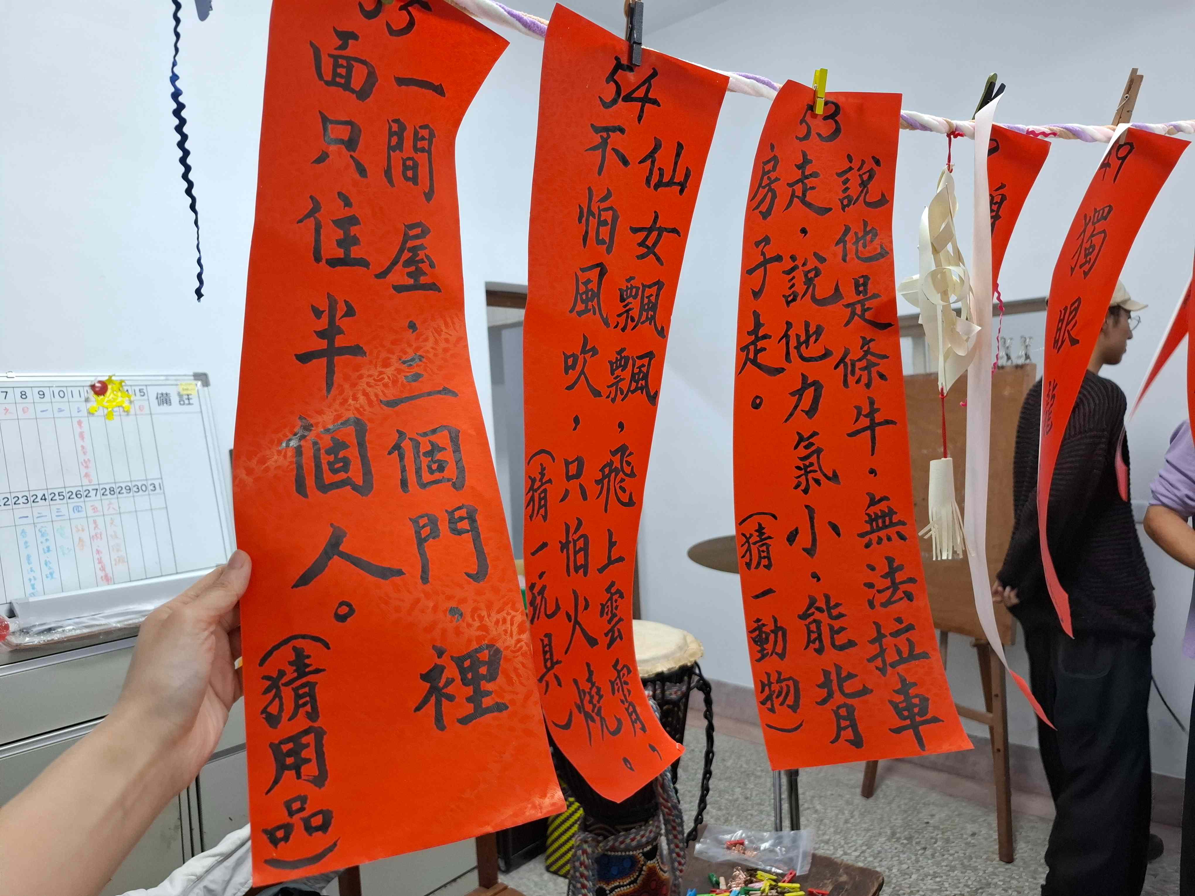 元宵之夜,燈火微暖。書法課的樹人老師準備了滿滿的燈謎,一題題寫在紅色春聯紙上,掛滿了1921的空間。