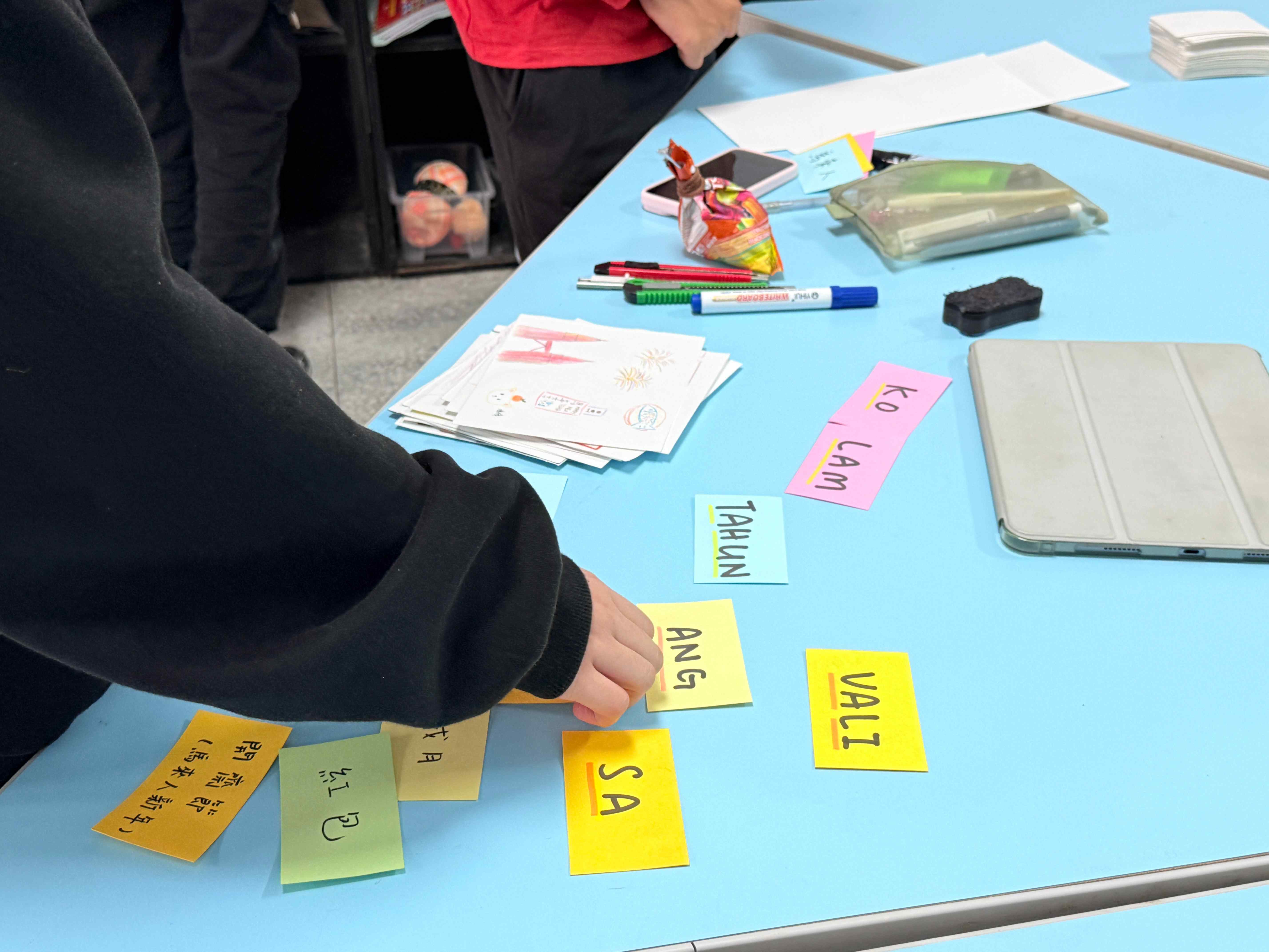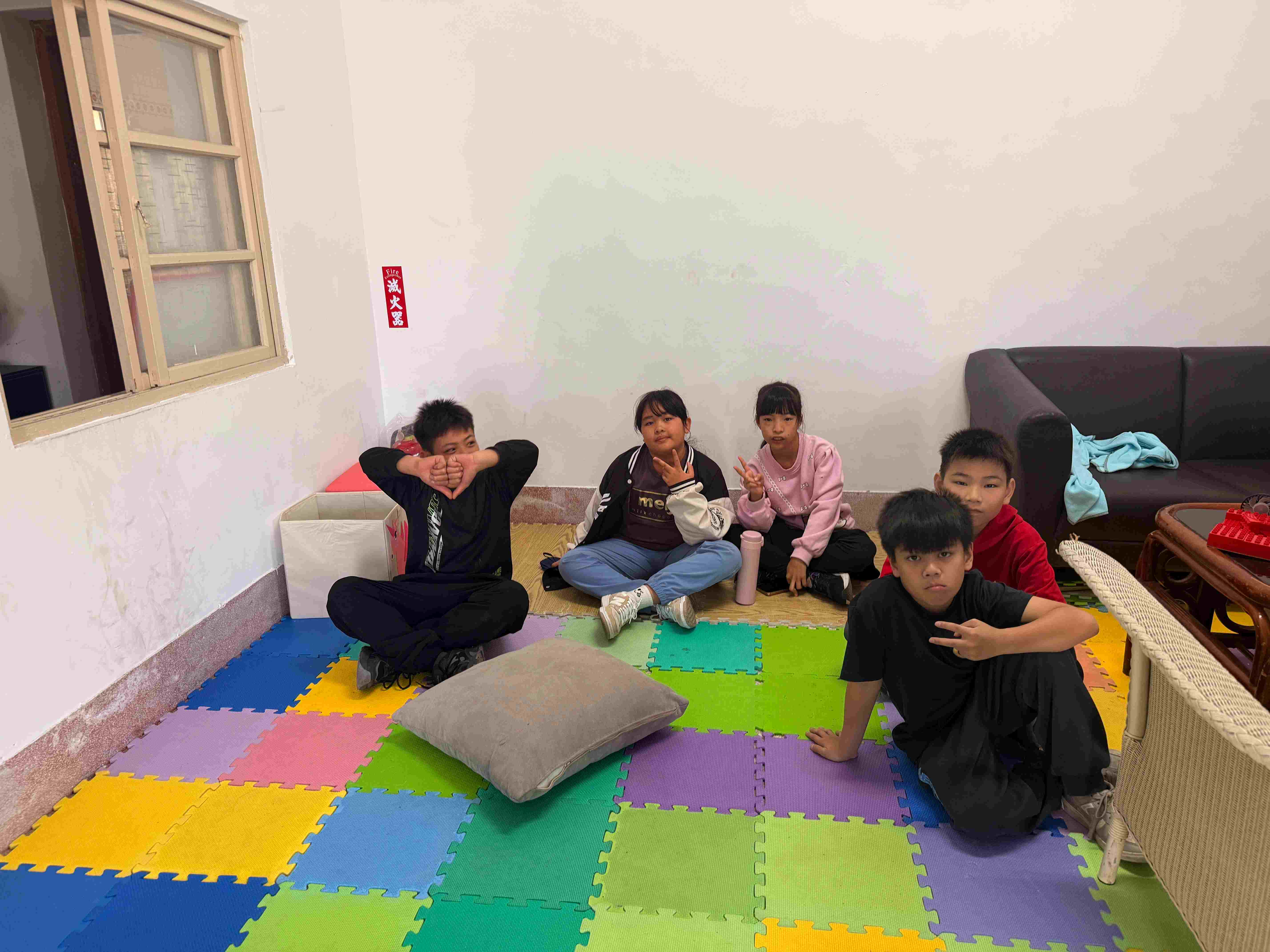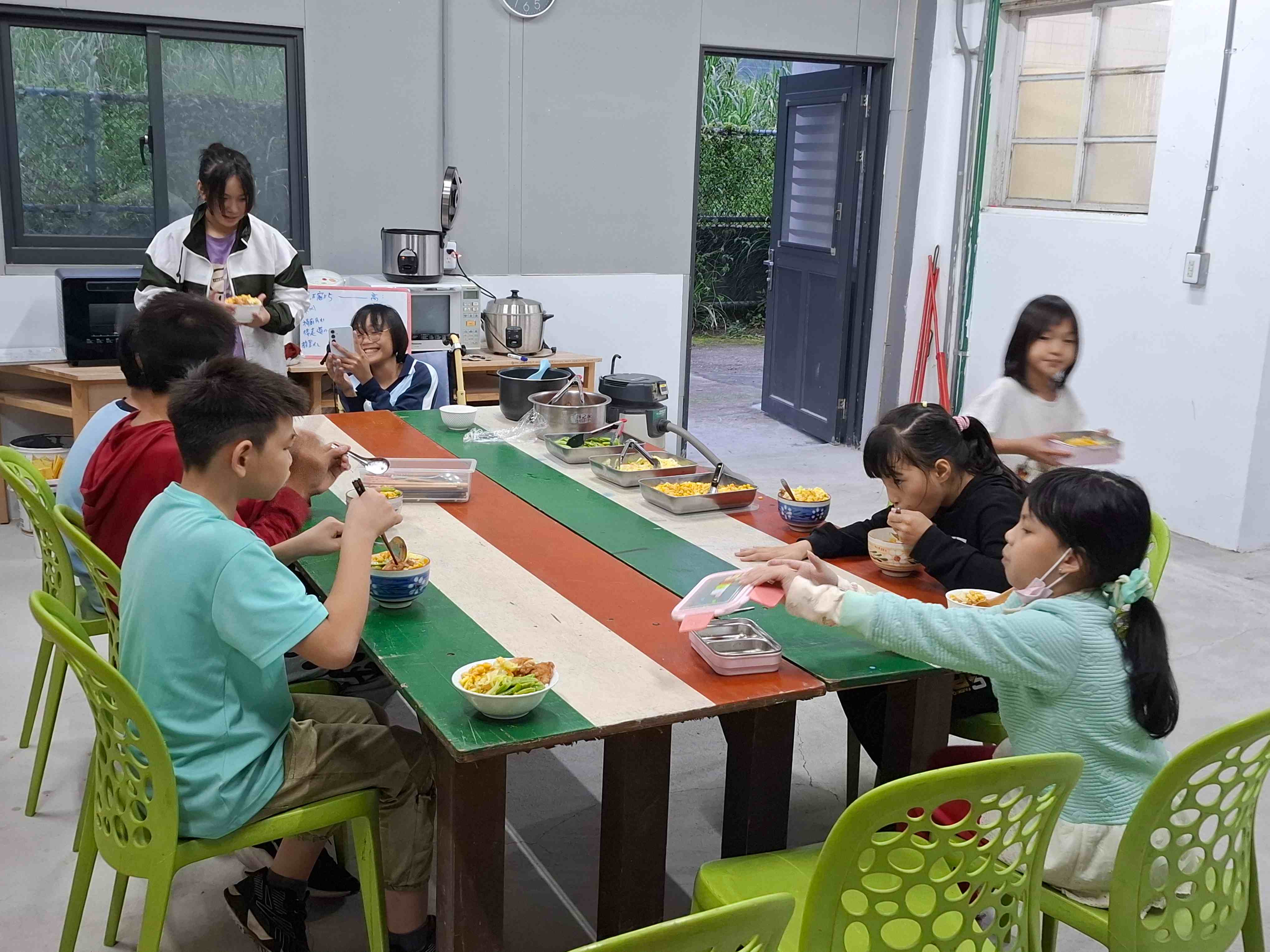 一群來自馬來西亞的學生來到五味屋擔任志工。他們與孩子們分享馬來西亞過年的習俗,也聊起各自家裡過年的樣子。大家圍坐在一起,用聊天的方式輕鬆交流,氣氛十分熱絡。中午時大家還一起吃午餐,孩子們對這群遠道而來的朋友感到十分好奇,也很開心有人願意來陪伴他們。