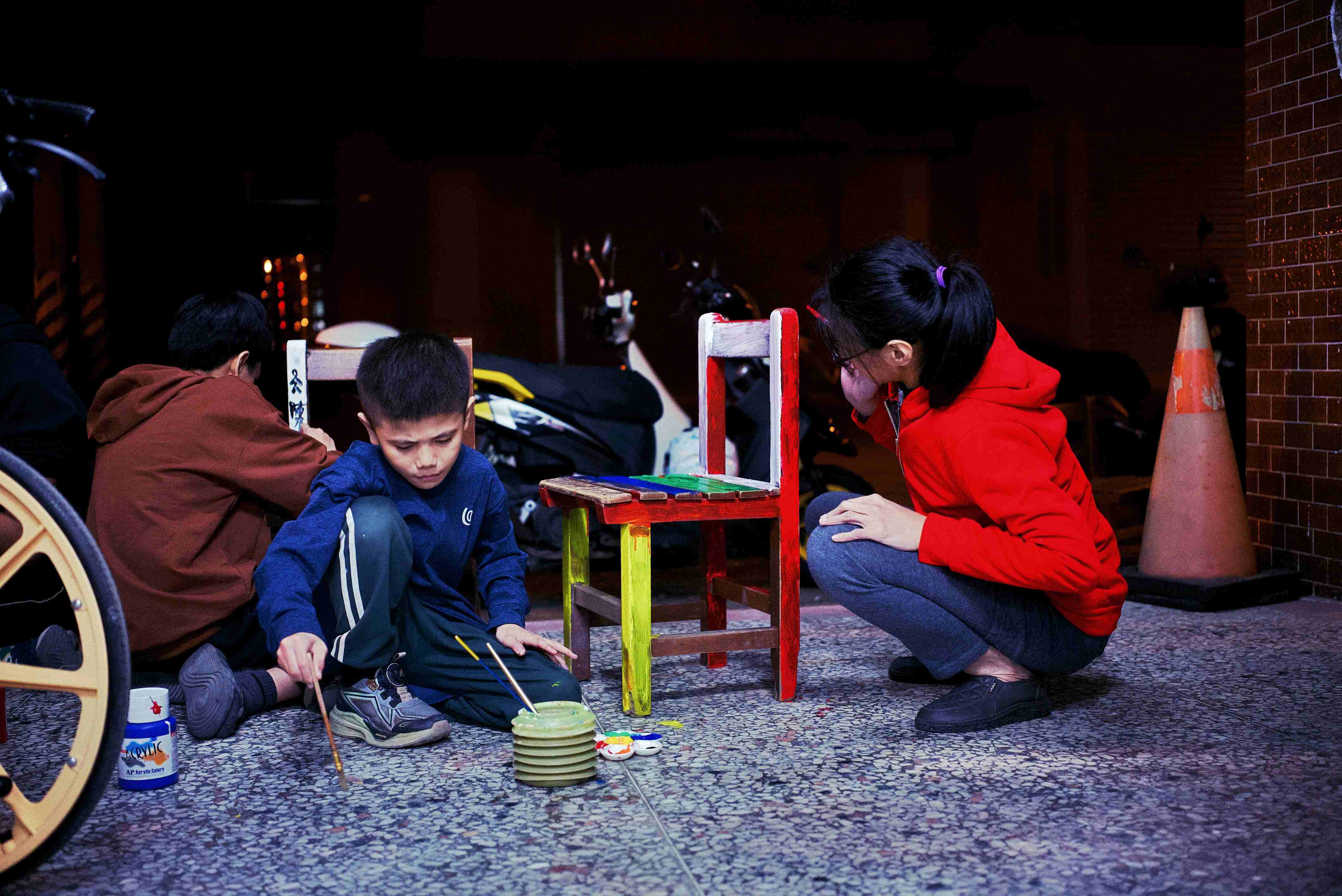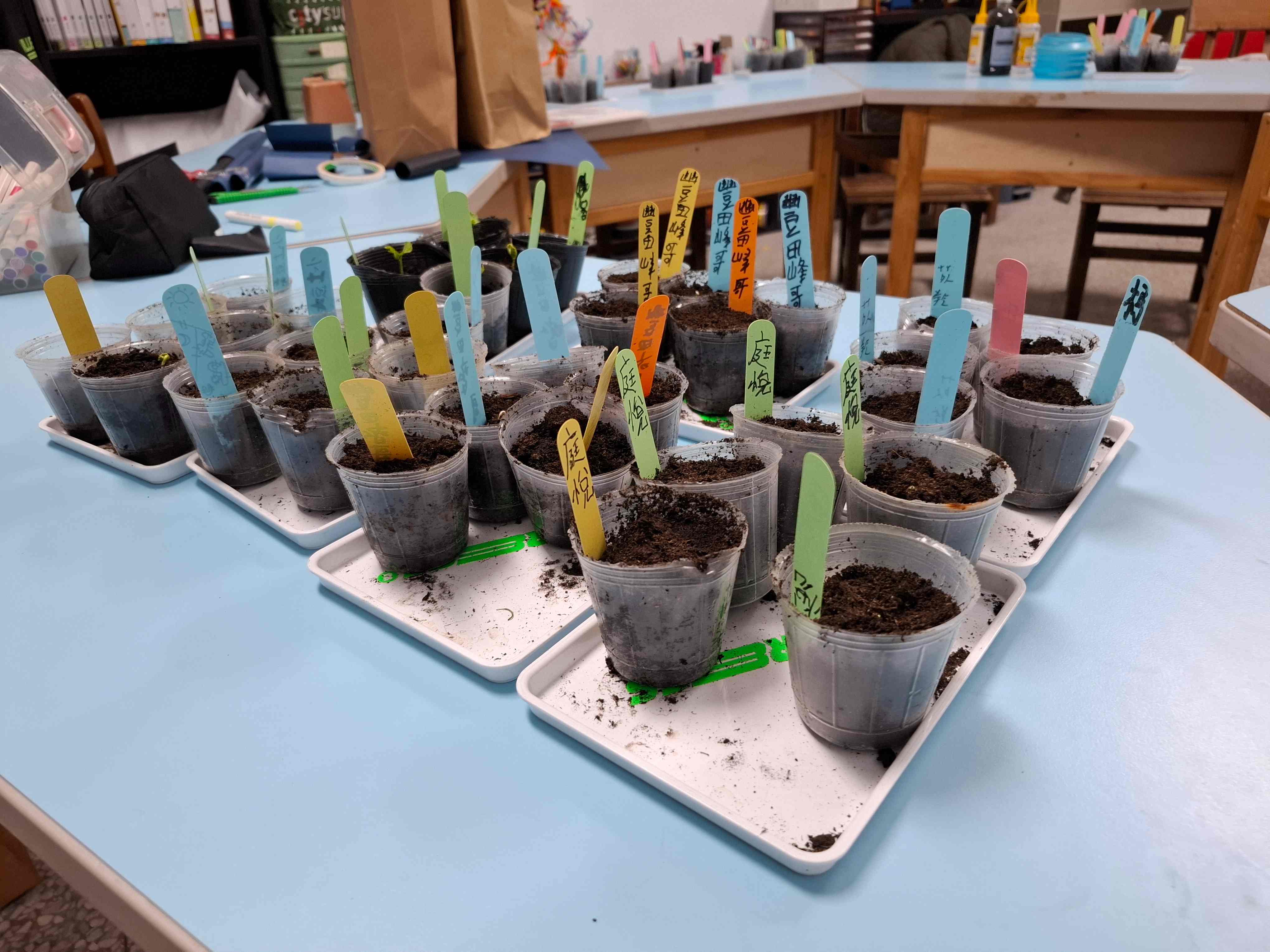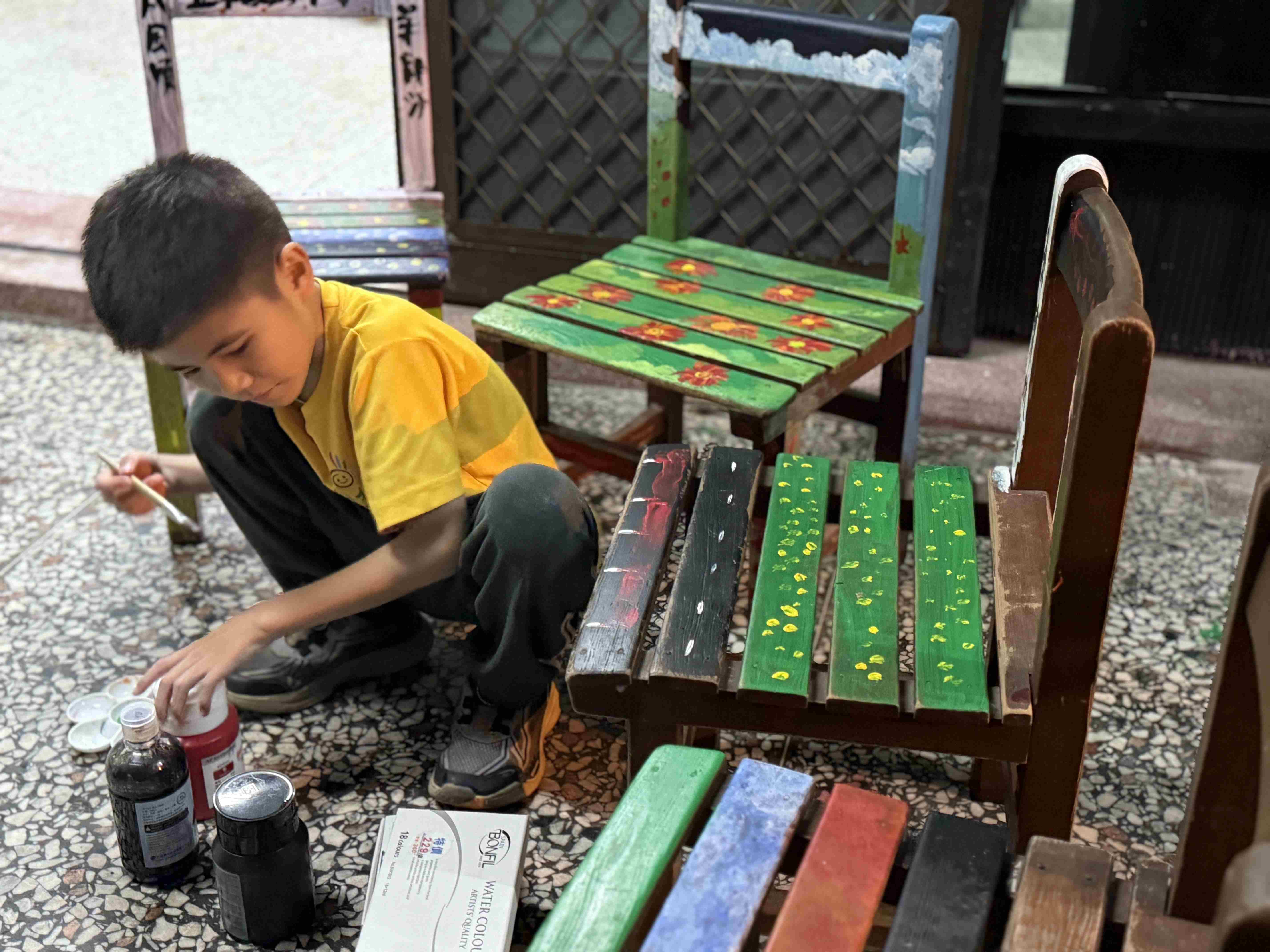隨著洛神花種子在課程中逐漸發芽,小老闆們也開始思考,如何為這些小小的盆栽打造一個既能展示、也方便照顧的空間。小老闆們在家瑜老師的帶領下,為洛神花苗打造一個特別的「苗圃新家」。孩子們利用原本不再使用的木頭椅子進行改造。兩到三人一組為一張椅子上色,為它「穿上新衣」。有的孩子在椅子上寫下給洛神花寶寶的祝福與期許,有的則畫上各式各樣的花朵與圖案,讓每一張椅子都成為獨一無二的作品。