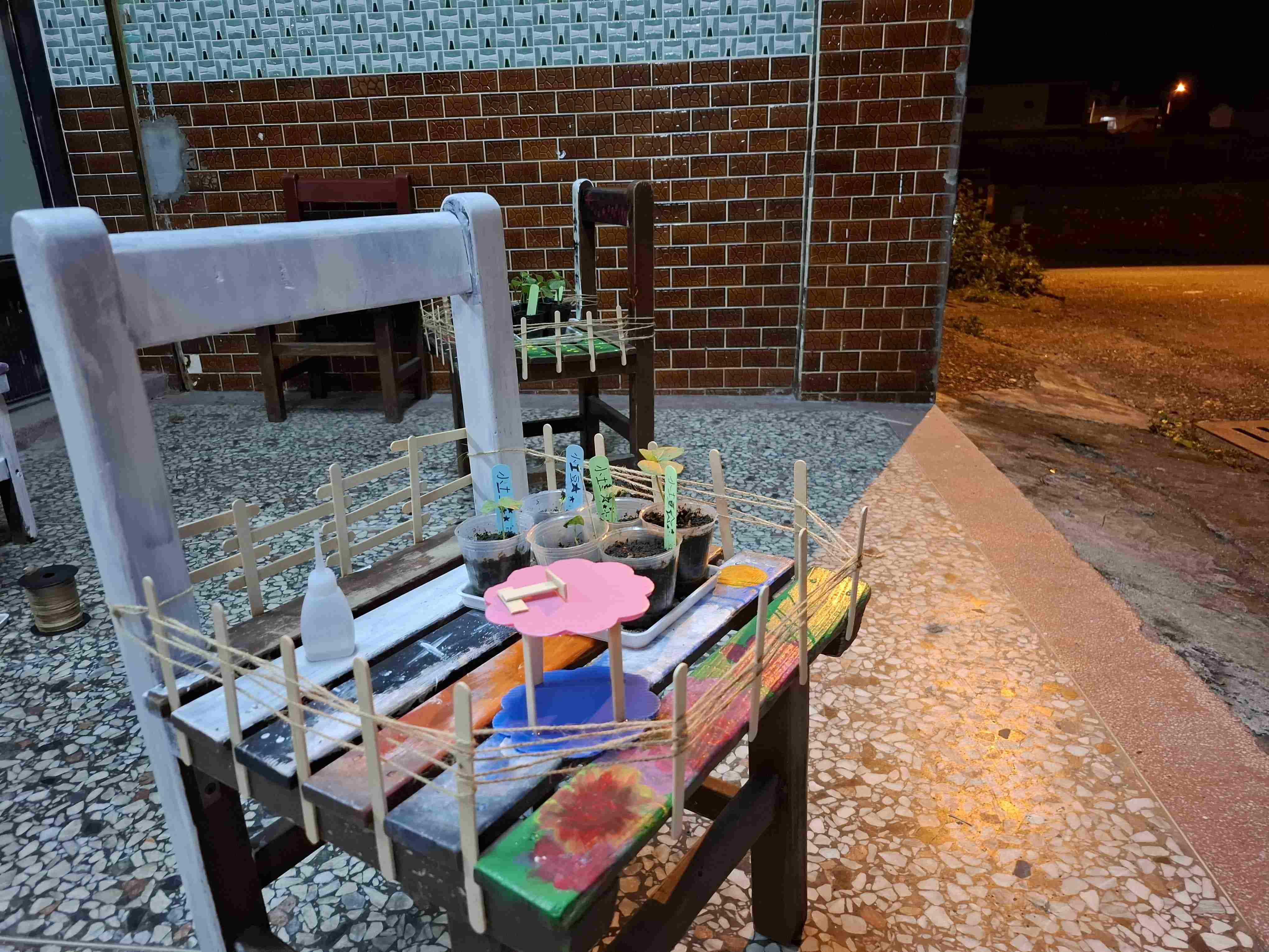 孩子們在椅子四周整齊地黏上冰棒棍,再以麻繩在冰棒棍之間一圈圈交錯纏繞,形成像小籬笆般的圍欄,為洛神花苗圃增添了層次與保護。透過老師的引導,孩子們不只學習彩繪技巧,也思考如何將課程與正在進行的洛神花計畫結合,讓作品不只是裝飾,更能在日常中被使用。