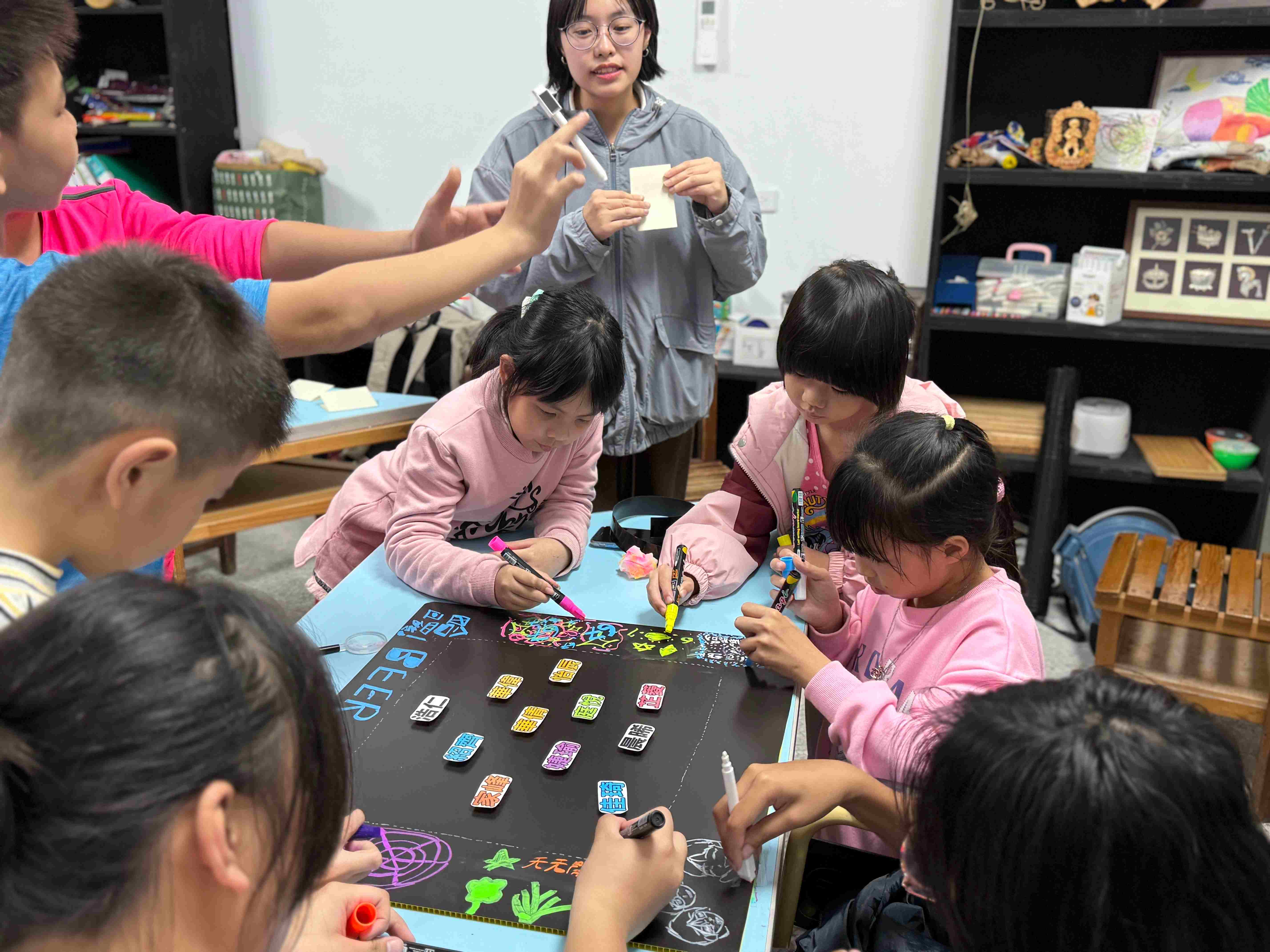 隨著搬到1921,孩子也逐漸適應新的空間、新的環境,也開始有不一樣的跟規範。孩子們每天用完餐後,都會進行分工整理環境,美術課時在家榆老師的帶領下,孩子們在分工板上進行彩繪,孩子們圍成一圈,每個孩子都畫上他們喜歡的部分。