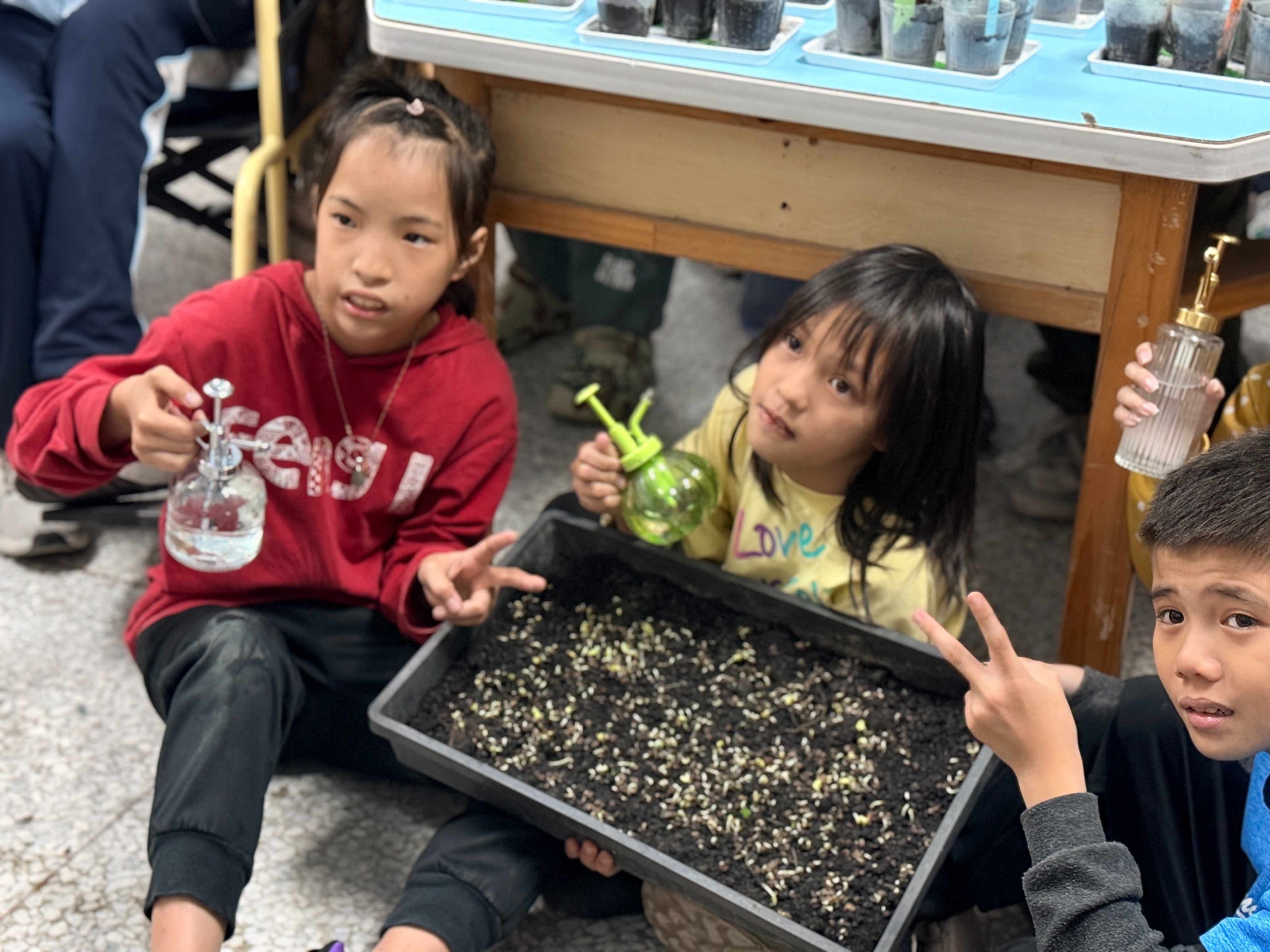 在顧老師的引導下,孩子們近距離觀察洛神花的種子:原本乾乾的小顆粒泡水後會逐漸變化,最終悄悄冒芽的新生命。孩子們透過自己的雙手,理解每個生命都需要細心照料,也感受到付出與收穫之間的連結。
