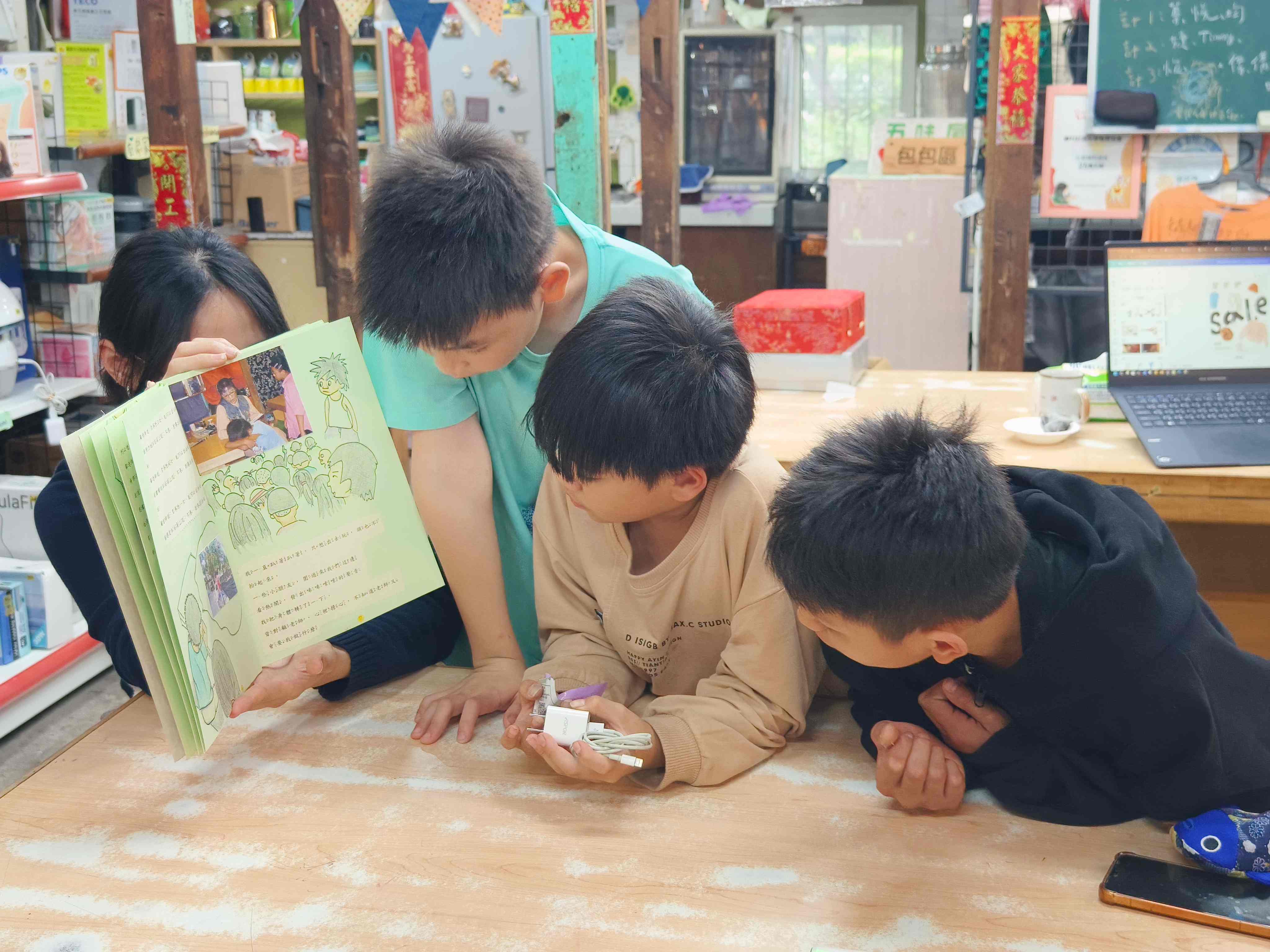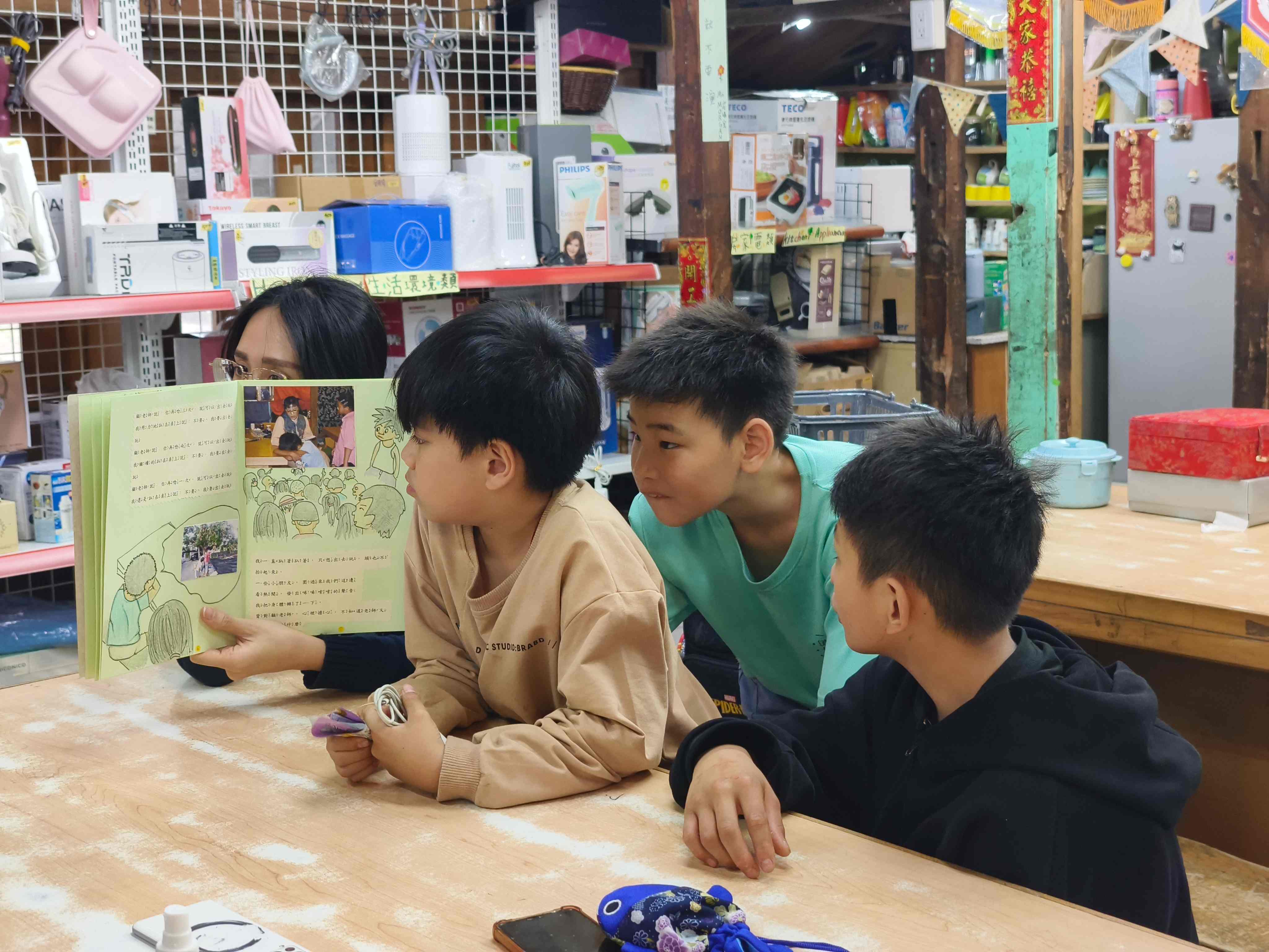 顧老師有一次帶著一本繪本來到五味屋,書名是《我只是想出去玩》。這本書的作者小勇,同時也是故事中的主角。因為不想跟著老師一起做小老闆的工作,他選擇趴在桌上,不理會任何人。透過繪本中細膩的插畫與對話,小勇的情緒被清楚地呈現出來──那份抗拒、無聲的反應,對孩子們來說並不陌生。